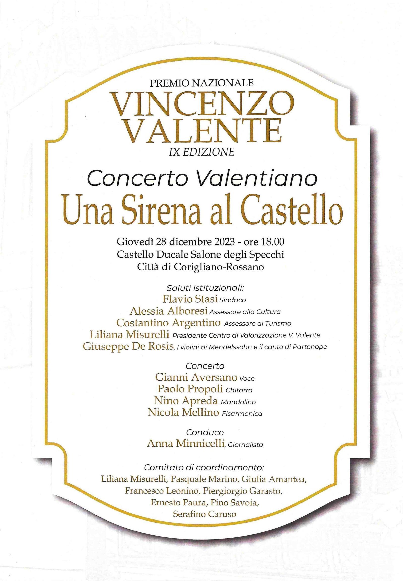 Il concerto valentiano “Una sirena al castello”, tenutosi nel 2023, ha rappresentato uno dei momenti più suggestivi delle celebrazioni per la nona edizione del Premio Nazionale Vincenzo Valente. Nella magica cornice del Castello Ducale di Corigliano-Rossano, l’evento ha reso omaggio al genio del Maestro attraverso un’accurata selezione di brani che hanno segnato la storia della canzone classica napoletana. Il titolo della serata, ispirato alla celebre composizione “‘A Sirena”, ha evocato atmosfere mitiche e passionali, trasportando il pubblico in un viaggio sonoro tra le radici calabresi e il successo partenopeo dell’autore. Esecuzioni magistrali di arie, romanze e canzoni d’epoca hanno riportato in vita lo spirito dei caffè-concerto e dell’operetta, generi in cui Valente fu protagonista indiscusso. La manifestazione ha visto la partecipazione di musicisti di alto profilo che hanno interpretato con rigore filologico spartiti rari e successi intramontabili. Oltre alla componente artistica, la serata ha offerto importanti spunti di riflessione sulla memoria storica e sull’identità culturale del territorio. L’iniziativa, promossa dal Centro di Valorizzazione Vincenzo Valente, ha confermato ancora una volta l’importanza di tramandare alle nuove generazioni un patrimonio musicale di inestimabile valore. Il pubblico ha accolto con grande fervore ogni esecuzione, lasciandosi incantare dalla fusione perfetta tra l’architettura storica del maniero e le melodie del Maestro. L’evento si è concluso tra lunghi applausi, consolidando il prestigio di un premio che continua a crescere di anno in anno per qualità e partecipazione.