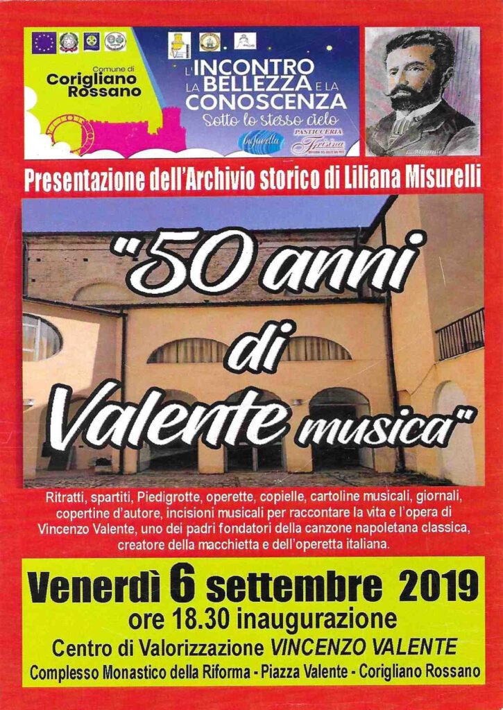 Corigliano Rossano – Cinquant’anni di musica tra ritratti, spartiri, operette, cartoline, incisioni, ecc. quelli che hanno caratterizzato la metodica raccolta tutta valentiana di Liliana Misurelli. Oggi il sogno di dare una dimora a tutto questo si è realizzato. L’Amministrazione comunale venerdì 6 settembre ha inaugurato l’Archivio Vincenzo Valente nel complesso monastico della Riforma, in piazza Vincenzo Valente, nella città di Corigliano-Rossano, arricchendo la Biblioteca F. Pometti con la sezione storico-musicale dedicata a Vincenzo Valente. Vincenzo Valente fu il padre dalla canzone napoletana classica, della macchietta e maestro di grande valore dell’operetta italiana. Egli visse e maturò musicalmente a Napoli ma fu Corigliano a dargli i natali il 21 febbraio 1855. Per permettere l’inaugurazione nella data del 6 settembre, giorno in cui si è spento nel 1921, è stato tanto l’impegno dall’assessore alla cultura della città, la dott.ssa Donatella Novellis, che ha superato le tante difficoltà insieme a tutto il personale dell’ufficio manutenzione del Comune.