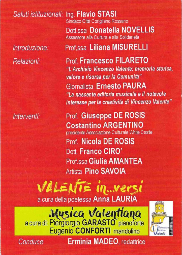 Alla festa organizzata per l’occasione, coordinata dalla redattrice Erminia Madeo, hanno preso parte il prof. Francesco Filareto, che ha parlato dell’importanza della memoria per una comunità e ha definito l’impegno di Liliana Misurelli un dono gratuito alla città e un’azione di alto profilo culturale; il giornalista Ernesto Paura, che ha affrontato un percorso storico dell’editoria musicale italiana specificando il ruolo avuto da Valente nella discografia dell’epoca. Tanti i contributi di elogio, dal prof. Giuseppe De Rosis alla prof.ssa Giulia Amantea, dal prof. Nicola De Rosis a Pino Savoia e Costantino Argentino. La poetessa Anna Lauria ha declamato alcuni componimenti sulla figura di Valente, tra cui una sua poesia scritta alcuni anni fa, mentre Franco Cirò ha letto stralci della biografia scritta da Misurelli-De Bartoli “I suoni dell’anima” (MIT, 2005).