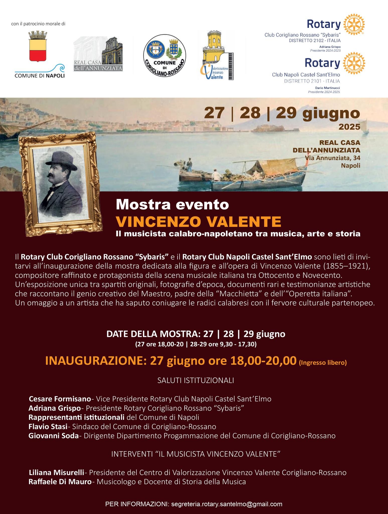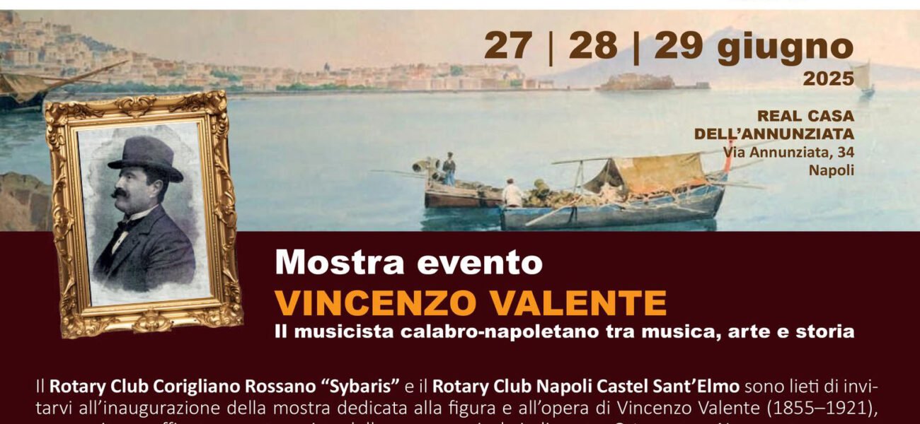 La mostra evento Vincenzo Valente: Il musicista calabro-napoletano tra musica, arte e storia ha riscosso un eccezionale successo di pubblico nella città di Napoli. L’esposizione è stata ospitata nei giorni 27, 28 e 29 giugno 2025 presso la suggestiva e storica sede della Real Casa dell’Annunziata. L’iniziativa è stata promossa con dedizione dal Centro di Valorizzazione Vincenzo Valente per celebrare degnamente i centosettanta anni dalla nascita del celebre compositore. L’evento ha goduto del prestigioso patrocinio morale del Comune di Napoli e del Comune di Corigliano-Rossano, unendo idealmente le due terre in un unico abbraccio culturale. Il percorso espositivo ha ripercorso con rigore la sfolgorante carriera del musicista, considerato a pieno titolo uno dei padri nobili della canzone classica napoletana. Attraverso l’esposizione di spartiti originali, preziosi documenti storici e testimonianze artistiche inedite, i numerosi visitatori hanno riscoperto un’eredità culturale immensa. L’inaugurazione ufficiale è avvenuta il venerdì pomeriggio alla presenza di illustri esperti, autorità istituzionali e autorevoli rappresentanti del mondo della cultura. La mostra ha messo in chiara luce il legame indissolubile tra le radici calabresi di Valente e lo straordinario successo ottenuto nella capitale partenopea. Particolare rilievo è stato dato alle sue celebri operette e a quelle composizioni che hanno segnato indelebilmente un’epoca d’oro per la musica mediterranea. L’evento napoletano ha confermato ancora una volta l’importanza di Valente come ponte culturale fondamentale tra la tradizione popolare e l’arte colta d’autore. Questa celebrazione ha rappresentato un momento di altissimo valore identitario, capace di restituire la giusta grandezza a un protagonista assoluto della storia musicale italiana.